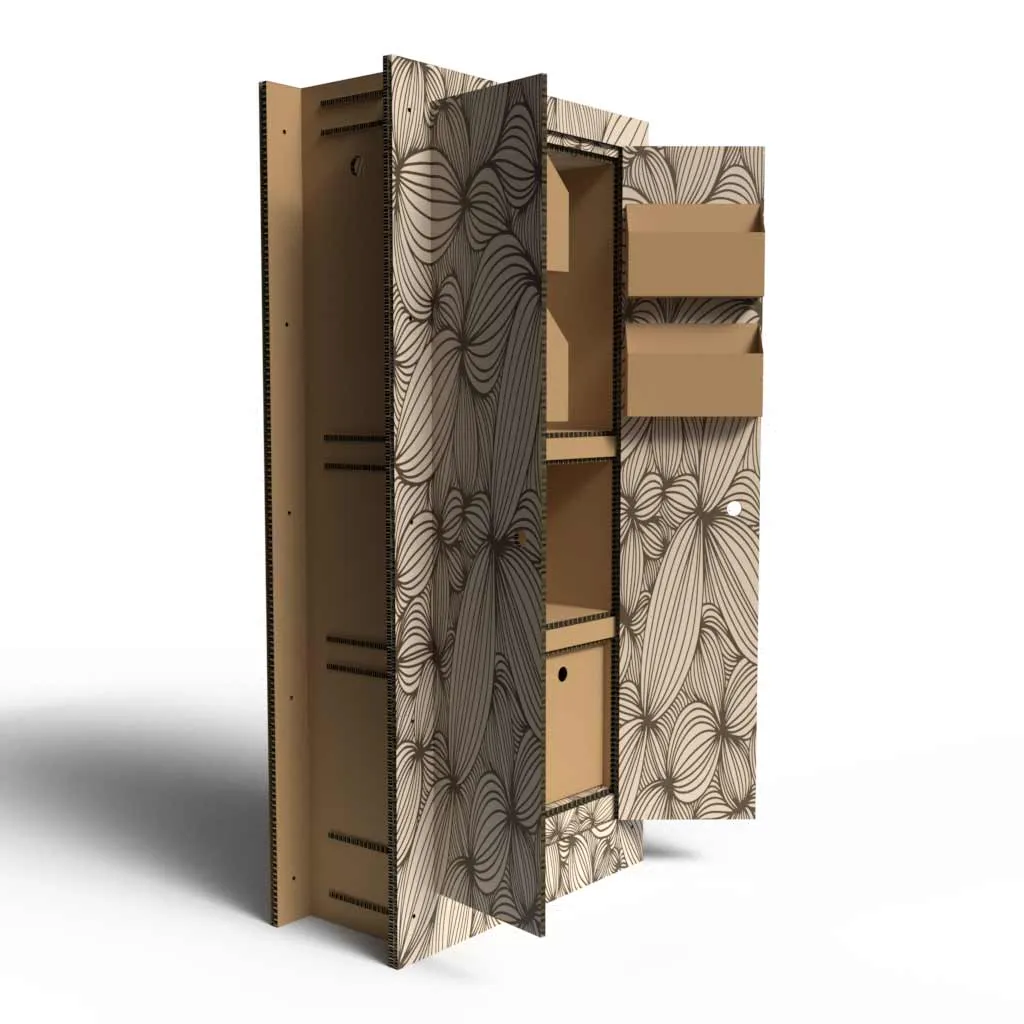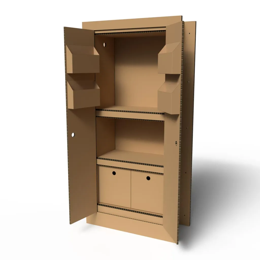Espositore da terra in cartone a forma di armadio, personalizzabile con mensole e cassetti automontanti.